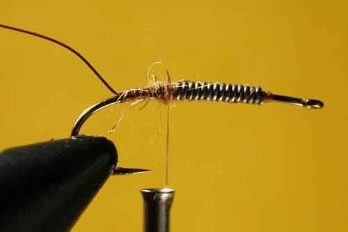 5. Dub the thorax-area. Wind the hackle back in three spirals. Hold the hackle back as you spiral the copper wire over its tip and then forward through the hackle to the eye. Bind and then trim off the end of the wire.